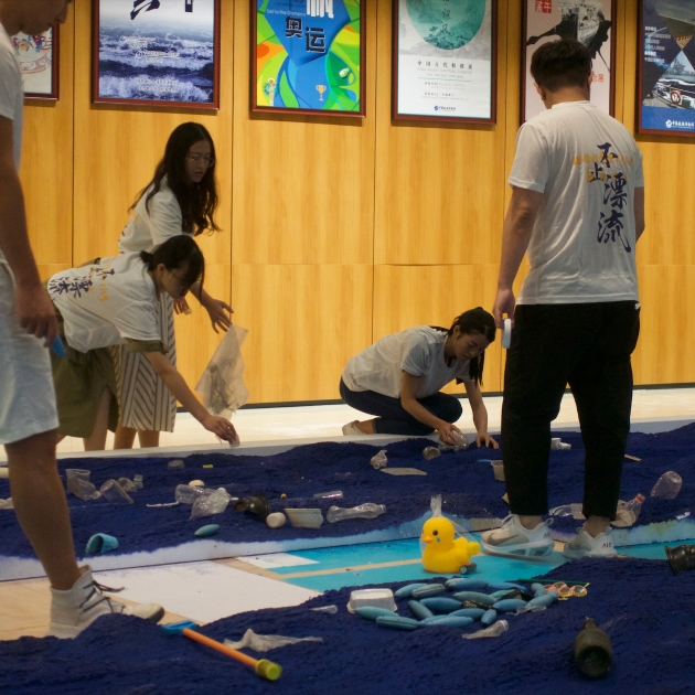 “全民参与,集体创作”“采用真实的垃圾作为创作材料”是这个艺术装置两个独特的标签。它以深蓝色为主色调,模拟浩瀚无际的海面,海面上漂浮着被人丢弃的小黄鸭、塑料瓶、泡沫塑料等各种海洋垃圾,艺术化展现了被处置不当的生活垃圾,最终漂流入海的场景。