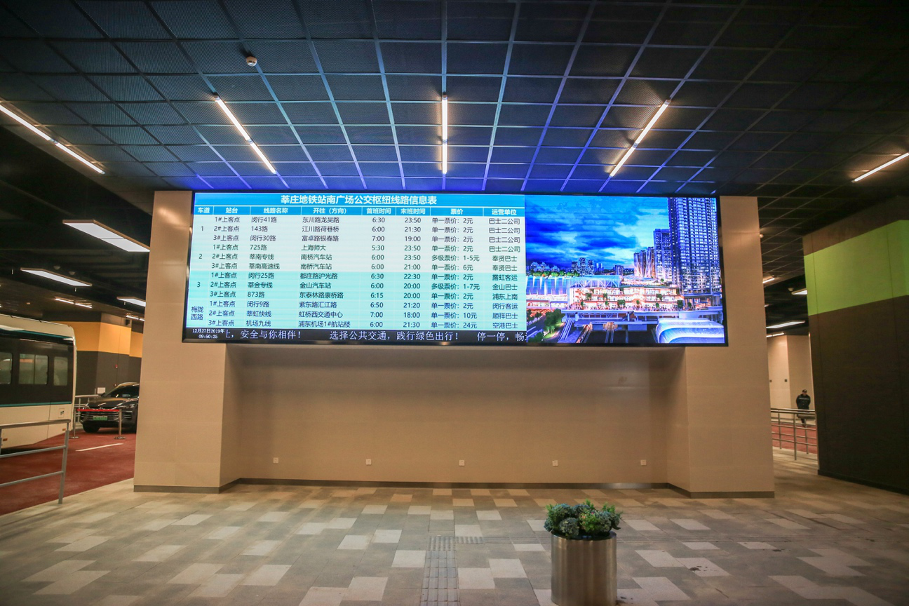 莘庄南广场公交枢纽站的工程建设贯彻了智能、环保、安全、便民的设计理念,打造“最美”的公交枢纽站形象。枢纽站设置有“智慧化”的公交管理系统,实现精准调度。站台中央设置了大型LED显示屏,实时发布公交信息。每条公交线路也设置了电子显示屏,提示该线路有关公交信息。智能照明可以通过探测环境光线自动调整车道出入口灯光照度。