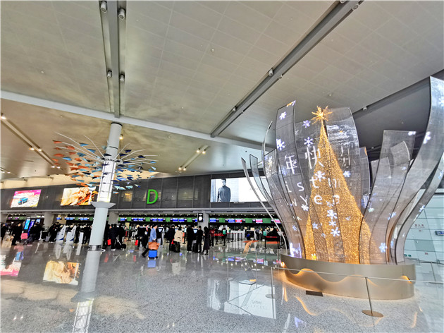 2019年即将接近尾声,虹桥机场也因地制宜开展新年主题布置。在航站楼出发大厅主要出入口的门楣上方均装点了花环、彩球等喜庆装饰,营造出浓郁的新年氛围。结合航班分布特点,1号航站楼国际及地区出发大厅以水晶树为元素、2号航站楼以上海市花白玉兰为元素,打造新年机场靓丽的海派风景线。