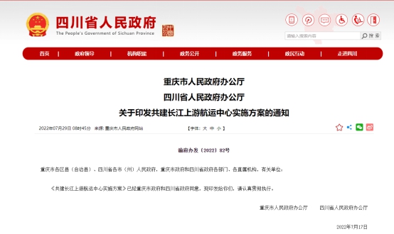 近日,重庆市人民政府办公厅、四川省人民政府办公厅印发了《共建长江上游航运中心实施方案》,其中提到:力争到2025年,基本建成航运产业要素聚集、航运服务功能健全、航运市场繁荣规范、具有国际和区域航运资源配置能力的长江上游航运中心,成为“一带一路”、长江经济带、西部陆海新通道联动发展的战略性枢纽。
