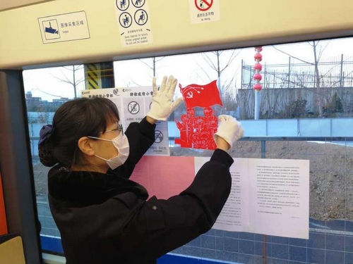 新冠肺炎疫情爆发以来,有轨电车驾驶员林燕超利用剪纸特长,创作了几幅作品贴在车窗玻璃上,表达市民和乘客对早日战胜疫情的期盼和同舟共济的信心。