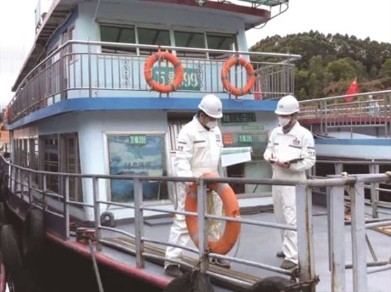 疫情期间,广州分社验船师冒雨完成对万绿湖库区客船的检验工作。