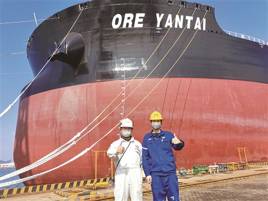 青岛分社验船师在疫情防控期间战斗一线,保证32.5万吨矿砂船首制船如期交付。