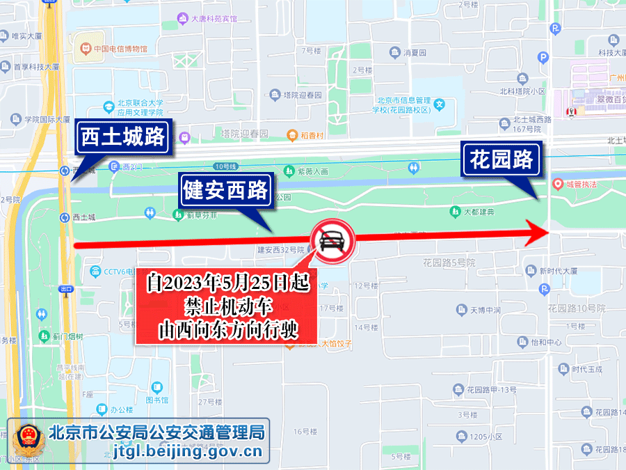为保障海淀区健安西路的交通安全顺畅,根据道路交通安全法律法规有关规定,决定自2023年5月25日起,海淀区健安西路(花园路至西土城路段)禁止机动车由西向东方向行驶。