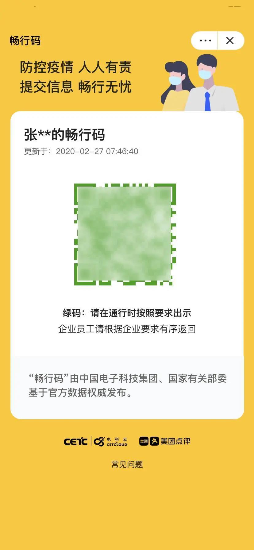 中国电科与美团合作,向全国各地政府、企事业单位推广“畅行码”,同时服务包括美团4.4亿用户在内的全社会用户。公众仅通过个人基本信息就可与数据资源池对比碰撞,自动生成安全可信的“畅行码”,有效解决了通行电子凭证没有统一标准、没有互认机制的问题,避免信息过度采集,保障数据安全。使用者可在美团App和美团微信小程序中领取“畅行码”。