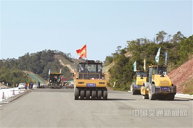 党员先锋队在紫惠高速公路T2标进行水稳层摊铺施工。曾峻 摄