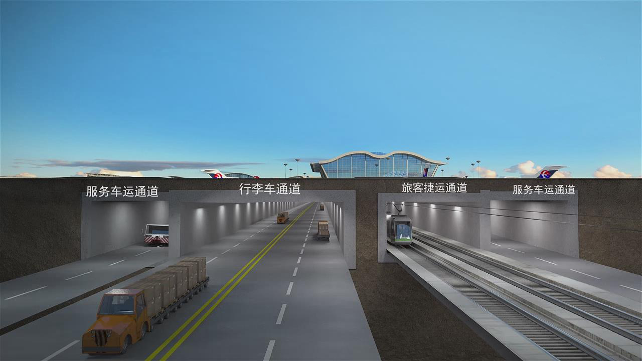其中,T1航站楼至卫星厅S1之间、T2航站楼至卫星厅S2之间分别设有两根服务车道、1根行李车道,T2航站楼至卫星厅S2之间还有一条捷运车通道,形成联系南北航站区的地下快速通道。