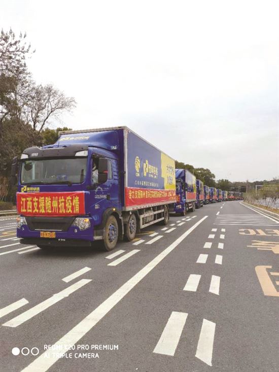 2月18日上午,江西省疫情防疫指挥部下达了一项紧急运输任务——对口支援湖北随州超300立方米的医疗防控物资和100吨粮油蔬菜等生活物资,所有物资次日运抵随州。接到任务后,参与紧急运输的所有成员立刻行动,排除装载测算误差、车辆临时调度、多地集运物资、后勤保障服务等难题,连夜奋战,保证了11车物资准时运达。目前,江西省已调用应急运力541辆次,运输口罩、帐篷等疫情防控物资以及生产防控物资所需设备和原材料共计9704吨,其中30%运往湖北武汉、随州。