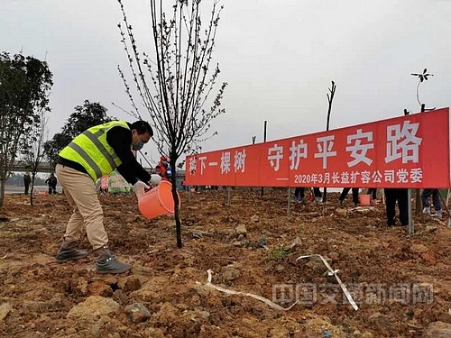 3月11日,长沙望城,湖南省高速公路集团有限公司的员工在长益高速公路扩容工程工地旁植树。种下一棵树,守护平安路。(特约记者江钻 供图)