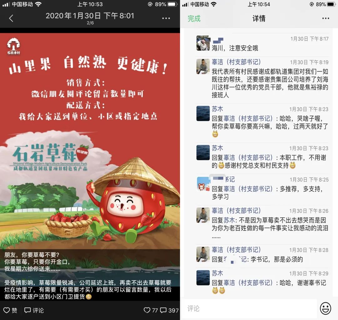 会设计的“销售员” 在朋友圈与乡亲们一起带货“草莓卖不出,关键是没有销售渠道”。大年初四,刘海川从巴中老家急急忙忙开车回到村里,一边组织防疫工作,一边当起了全村草莓的“销售员”。他发挥特长,把草莓销售信息制作成精美海报,发到朋友圈、微信群、QQ群,利用网络进行传播扩散,吸引了广大网友关注并线上下单,而他又在线下逐一进行“无接触”配送。