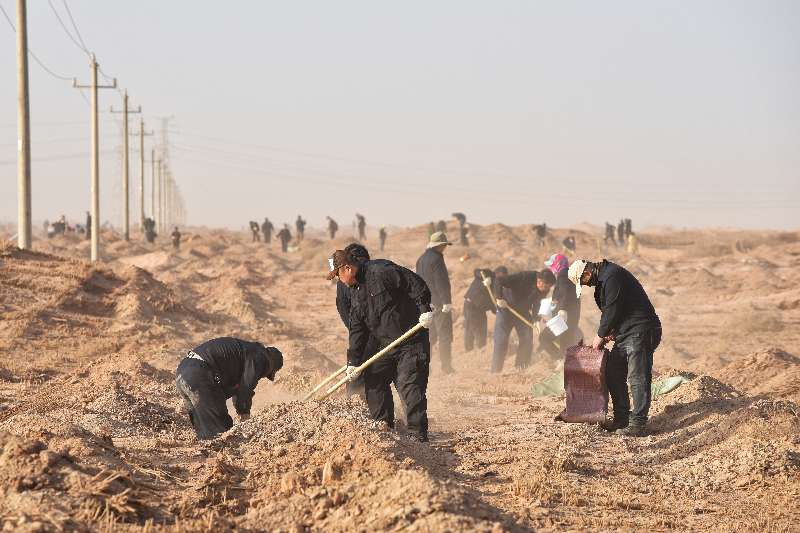 飞扬的尘土中,人们将一株株套着管材的梭梭种植在戈壁滩上,仔细培土,小树渐渐成行。