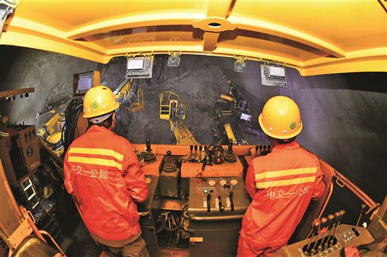 建设者操作三臂凿岩台车进行钻孔作业。