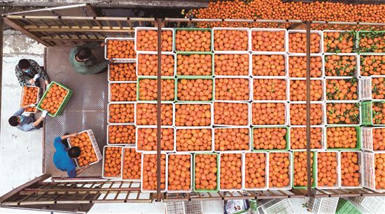 图为秭归县水田坝乡上坝村村民正在搬运新采摘的脐橙。郑家裕摄