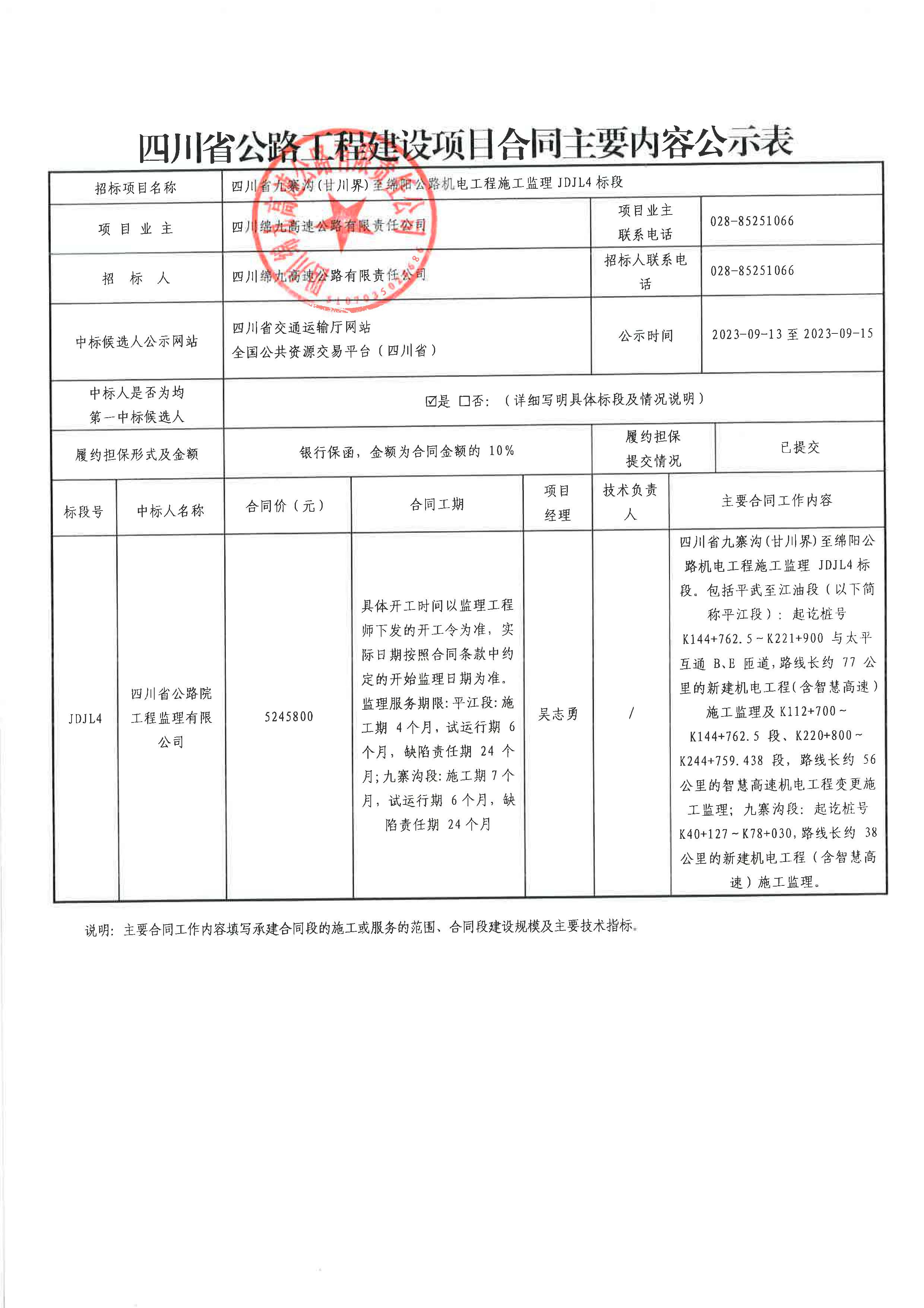 四川省九寨沟(甘川界)至绵阳公路机电工程施工监理JDJL4标段合同主要内容公告