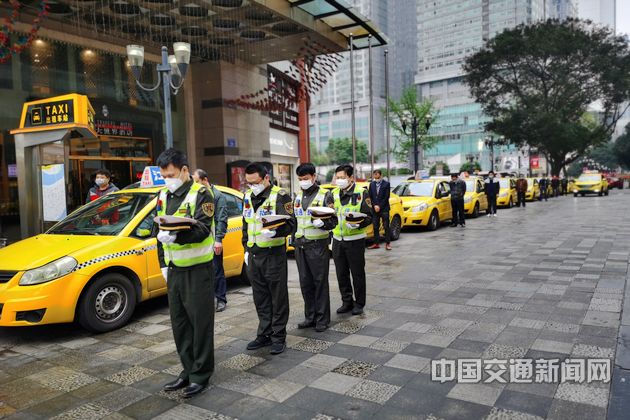 4月4日10时,重庆市交通运输综合行政执法总队直属支队渝中区大队执法人员及出租汽车驾驶员,在解放碑出租汽车候乘站向新冠肺炎疫情牺牲烈士和逝世同胞默哀。
