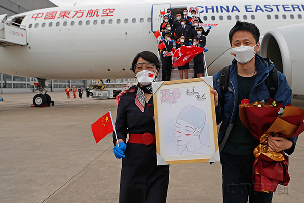 以爱为墨,“画”浅情深。航班中,王芫波、张莹夫妻档以《最美逆行》、《感恩有你》、《英雄凯旋》三幅手绘画分别向上海市第一人民医院、上海市第五人民医院、上海市第七人民医院的雷神山英雄们致敬!有人说:“爱,是你送我会哭的礼物,医者仁心,大爱无疆 ,今天256名天使又为乘务员带来了别样的感动,一封情真意切的感谢信、50位英雄的签名的防护服、独家设计的环保袋、崭新的防护工作服、《目送妈妈去武汉》的温馨画作......太多的礼物,太多的故事,短短的航班,却有满满的眼泪。