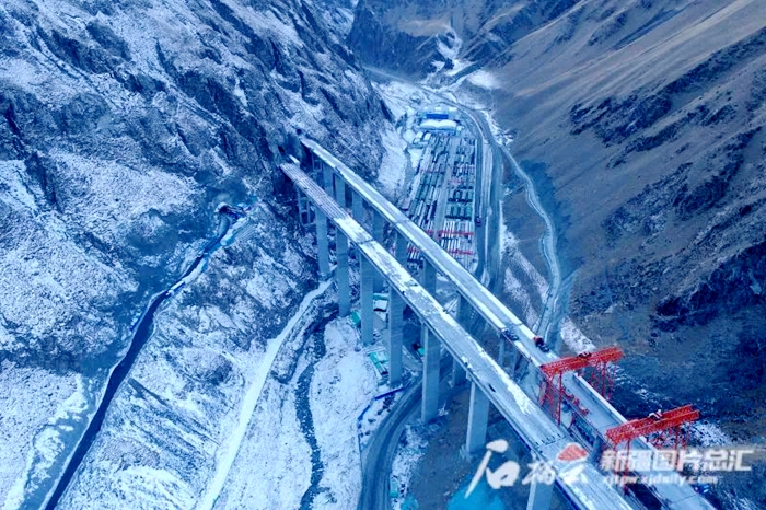 “预计月底巴拉提特大桥左幅完工,大桥也随之完工。”中国交建新疆乌尉公路包PPP项目乌尉土建第四标段项目部总工程师吴兴旺说。第四标段位于天山腹地,路线全长11.658公里,桥梁和隧道占比达99%,其中巴拉提特大桥左线长2487.5米、右线长2557米。
