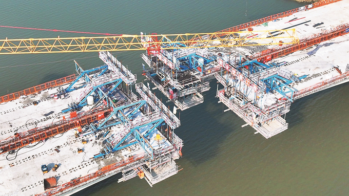 善后河特大桥全长约1981米,是连宿高速公路连云港段单跨最长的控制性节点工程,120米长的主跨建设目前已进入冲刺阶段,即将合龙。图为12月5日拍摄的连宿高速公路善后河特大桥工程建设现场。 耿玉和 摄 (视觉江苏网供图)