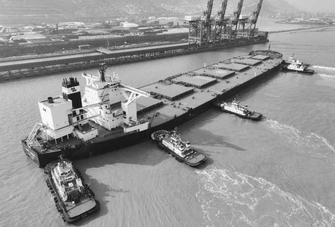 满载的40万吨级散货船“巴西矿石”轮在拖轮协助下靠泊连云港港