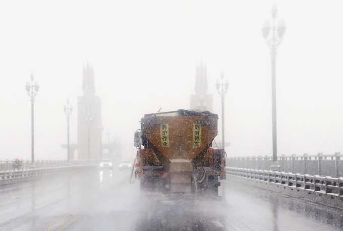 南京公路养护部门在长江大桥撒布融雪剂。 记者 郎从柳 摄