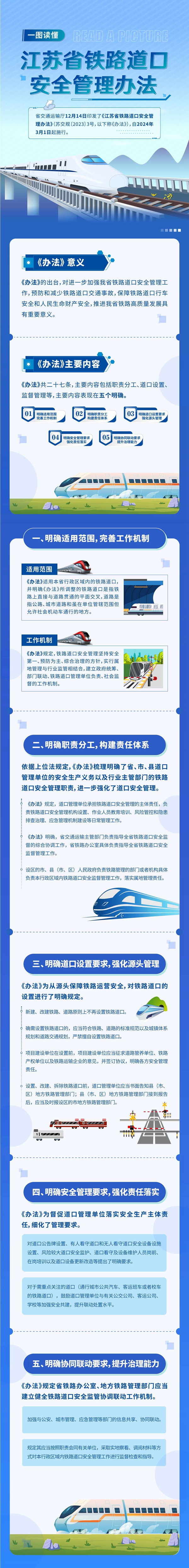 近日,省交通运输厅印发《江苏省铁路道口安全管理办法》(以下称《办法》),将于2024年3月1日起施行。《办法》的出台,对进一步加强我省铁路道口安全管理工作,预防和减少铁路道口交通事故,保障铁路道口行车安全和人民生命财产安全,推进我省铁路高质量发展具有重要意义。