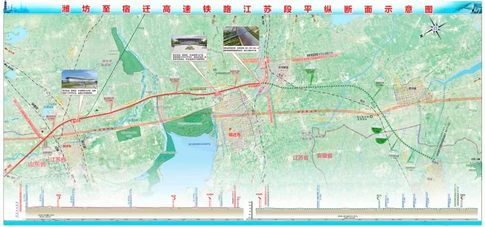 潍宿高铁是国家规划的干线铁路项目,也是京沪高铁辅助通道的重要组成部分,北起山东潍坊,向南经日照、临沂,进入我省徐州新沂,在宿迁市与徐宿淮盐铁路实现互联互通。项目正线全长约399公里,设计时速350公里,建设工期4年半,其中江苏段正线长约74公里,在徐州市设新沂东站,在宿迁市设宿迁东站和洋河北站。