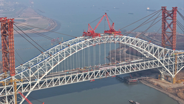 常泰长江大桥主航道桥为斜拉桥,专用航道桥为钢桁拱桥。录安洲专用航道桥与主航道桥一样,为非对称布置桥梁,主跨388米,为世界最大跨度公铁两用钢桁拱桥。录安洲专用航道桥使用不同类型和长度的杆件共802根,单根杆件最大重量达121吨,除弦杆顶板采用熔透焊接连接外,其余杆件均在节点处采用高强螺栓拼接。录安洲专用航道桥钢材用量约4万吨,高强螺栓用量约47万套。