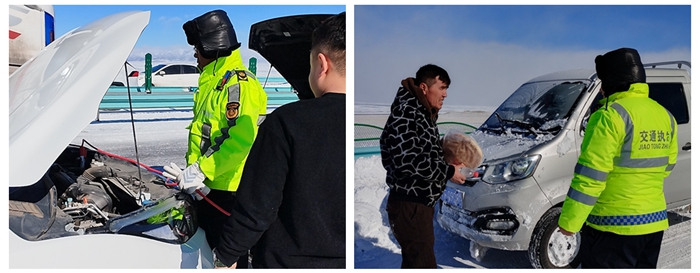 应急救援暖人心。大队第一时间组织执法人员对辖区路面开展巡查,对滞留在高速公路上的旅客和车辆进行帮助救援,努力把极端天气对道路通行的影响降到最低。2月17日上午13时43分,大队执法人员巡查至G30线K1455+000米处下行线,发现一辆白色小轿车停靠在路边,经询问得知该车辆因亏电无法启动,大队执法人员立即找来勾电线,帮助车辆重新启动。从阿克苏赶往伊犁的艾力买买提驾驶一辆小型货车,被困在G30线K4155+550米处上行线,大队执法人员为他送上馕和水,在寒冷的天气中带去浓浓暖意。此次道路限行期间,大队共紧急救援亏电、爆胎等受困车辆6辆。