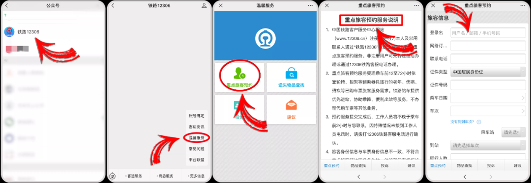 拨打12306客服电话,跟客服工作人员说明所乘坐的车次、时间、车站、联系方式及所需要服务的内容等信息,铁路部门接到需求后,将尽力提供轮椅、担架等辅助器具,提供优先进站、协助乘降、便捷出站等服务。