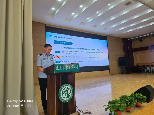 新学期伊始,为切实筑牢校园安全防线,增强学生法治意识与自我保护能力,9月3日东胜公安分局解放路派出所副所长兼吉劳庆小学法治副校长蔺海走进校园,以“安全同行,法治相伴”为主题,为全体学生带来了一堂生动且深刻的开学第一课,重点围绕交通安全与防范校园霸凌两大核心内容展开。