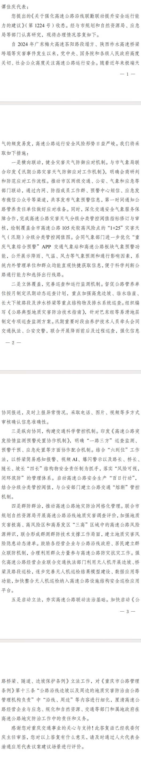 重庆市交通运输委员会关于市六届人大三次会议第1224号建议办理情况的答复函